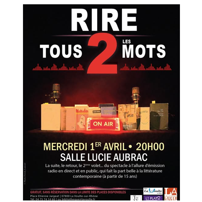 Spectacle humoristico-littéraireLe mercredi 1er avril à 20h, sans blague, découvrez la nouvelle création de la compagnie TSF : "Rire 2 tous les mots", et retrouvez l'ambiance faussement ouatée et loufoque du premier volet (accueilli à la médiathèque Lucie Aubrac en 2024) de ce faux crochet radiophonique irrésistible !
